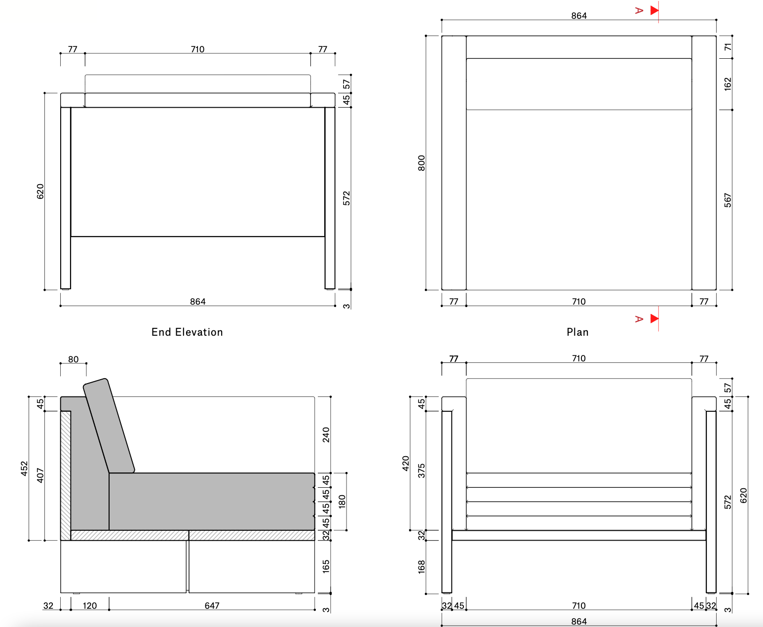 The sofa and lounge chair express the planks on the side elevation, while the cushions continue the theme of assembled and layered elements. The daybed and coffee table are considered lower versions of the dining table.