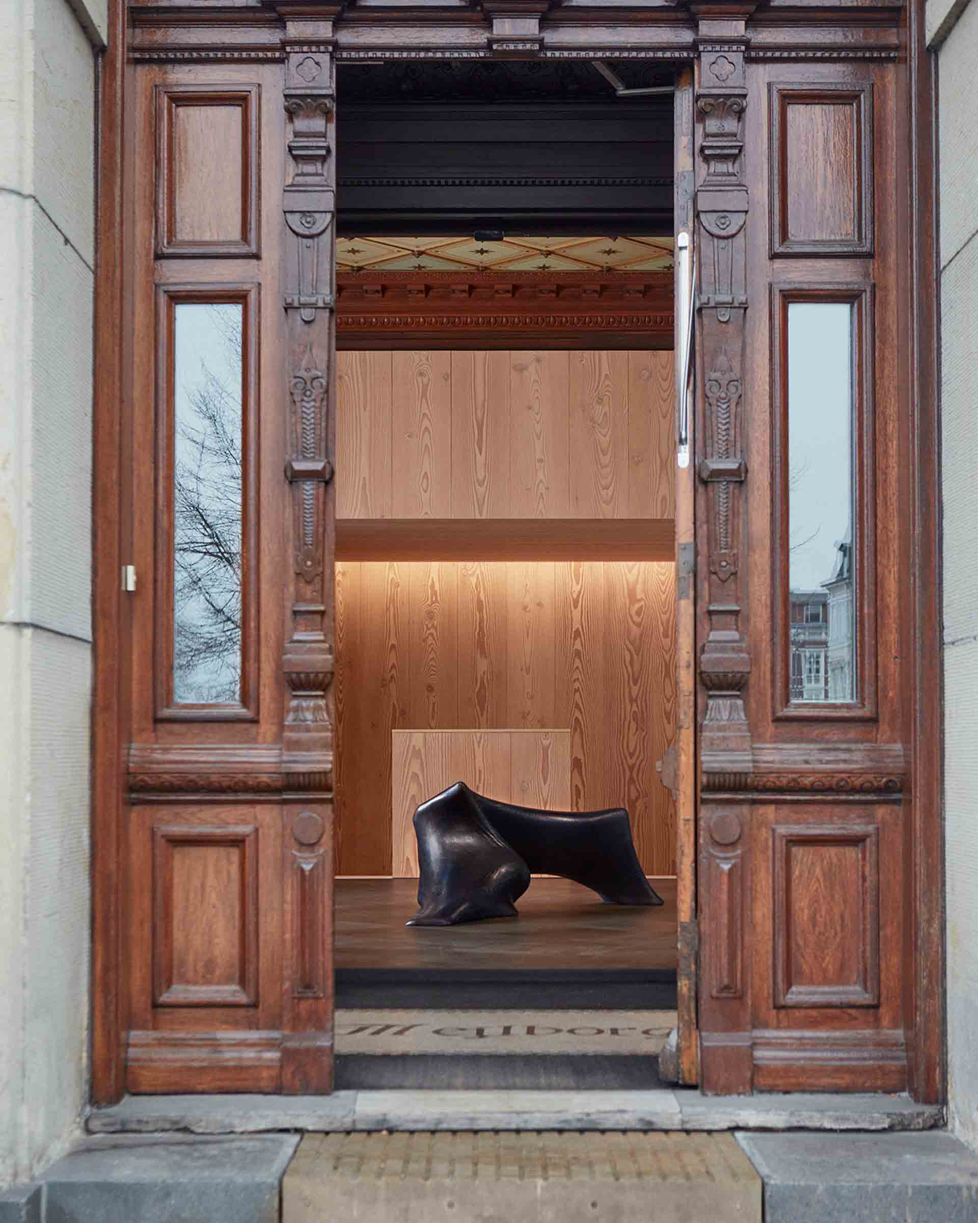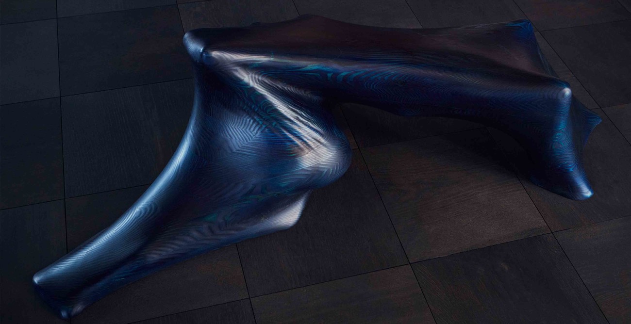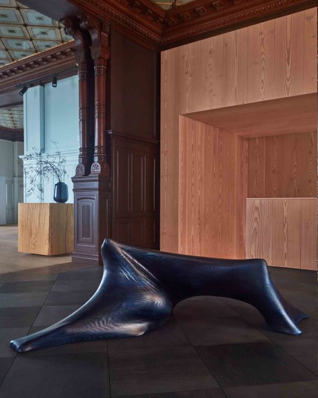 The sculpture is titled ‘Day Bed’ and embodies an investigation into the subtle architectures of the human body in dialogue with other materials. The piece is made entirely out of offcut wood material from the Dinesen production. Finger joints are used on the end grains in order to merge the disjointed patterns together more harmoniously, as well as to provide extra stability in the piece.