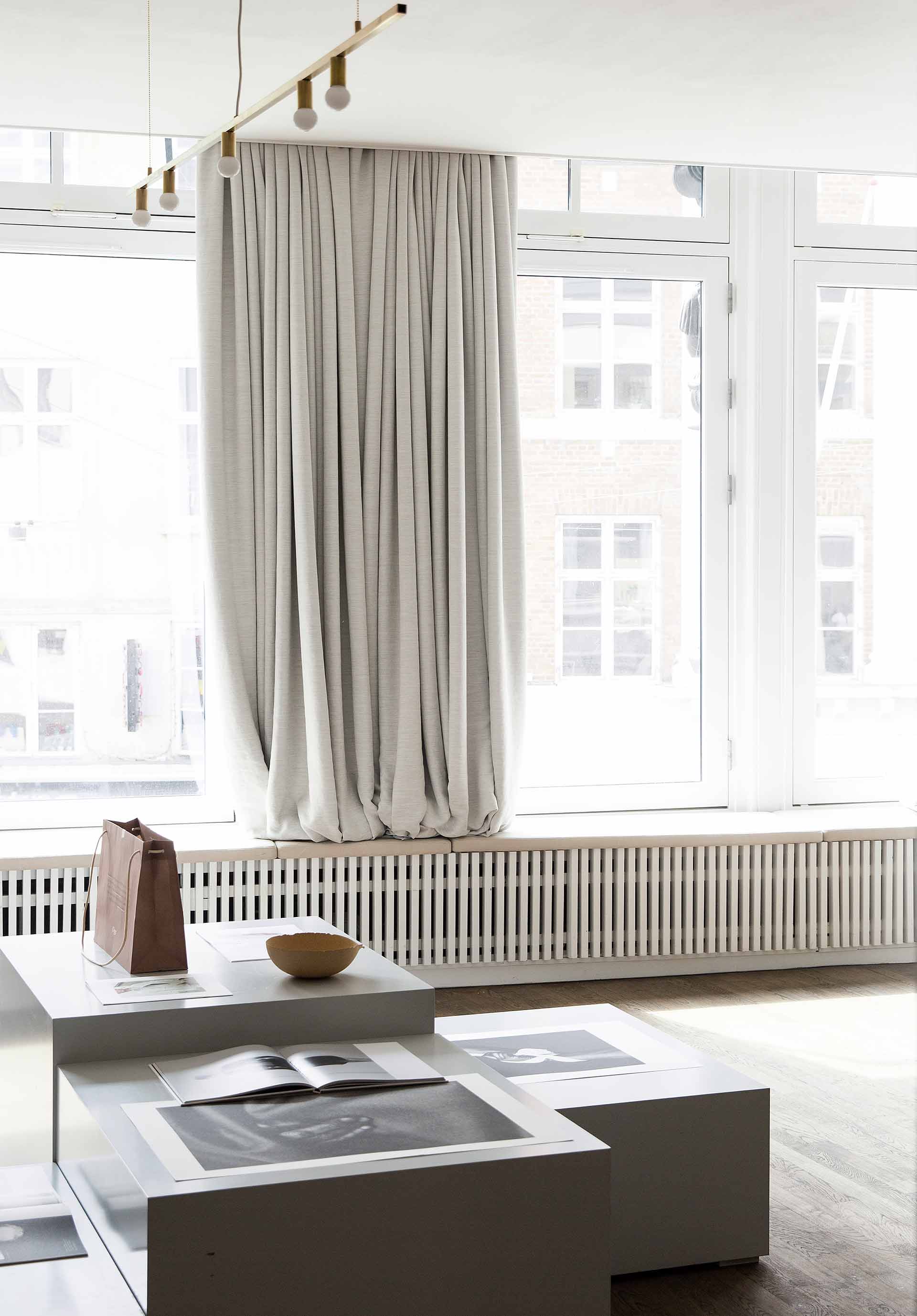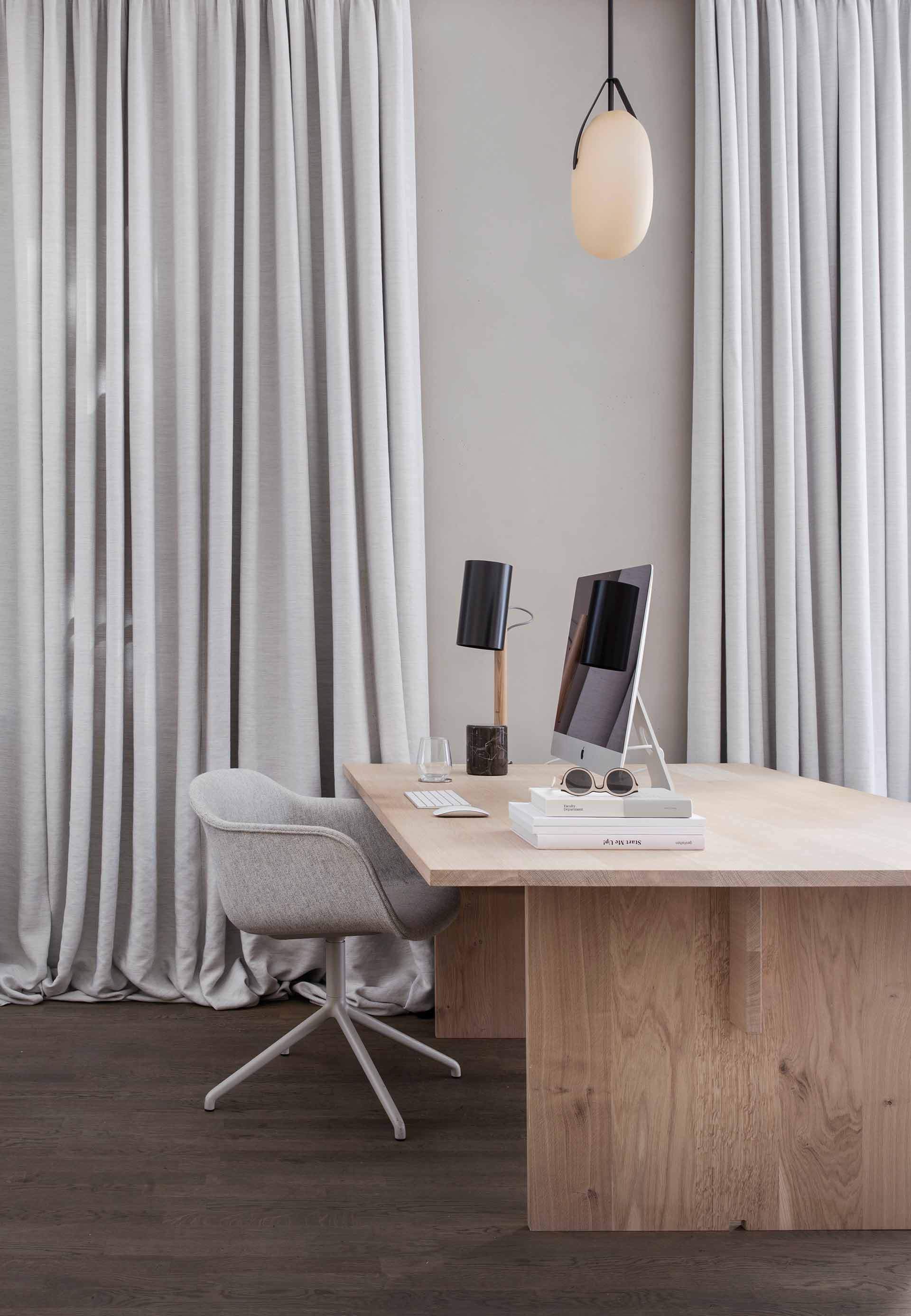In the final section is an open-plan workspace disconnected from the public areas – both physically and in terms of style. The office area has heavy curtains, sandy-toned walls and is furnished with banks of tables designed by Norm Architects and produced by the Danish design company Paustian in Dinesen Oak.