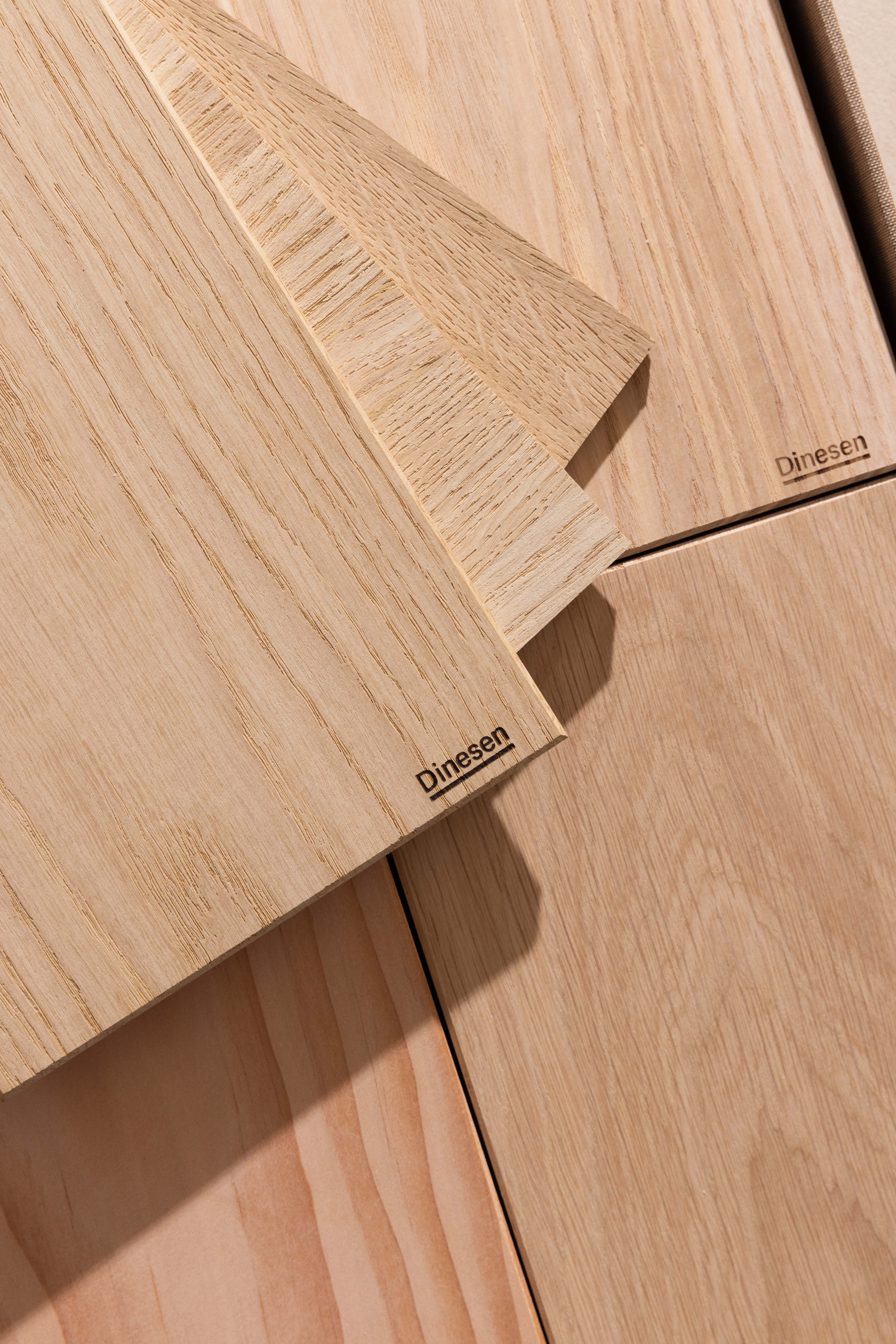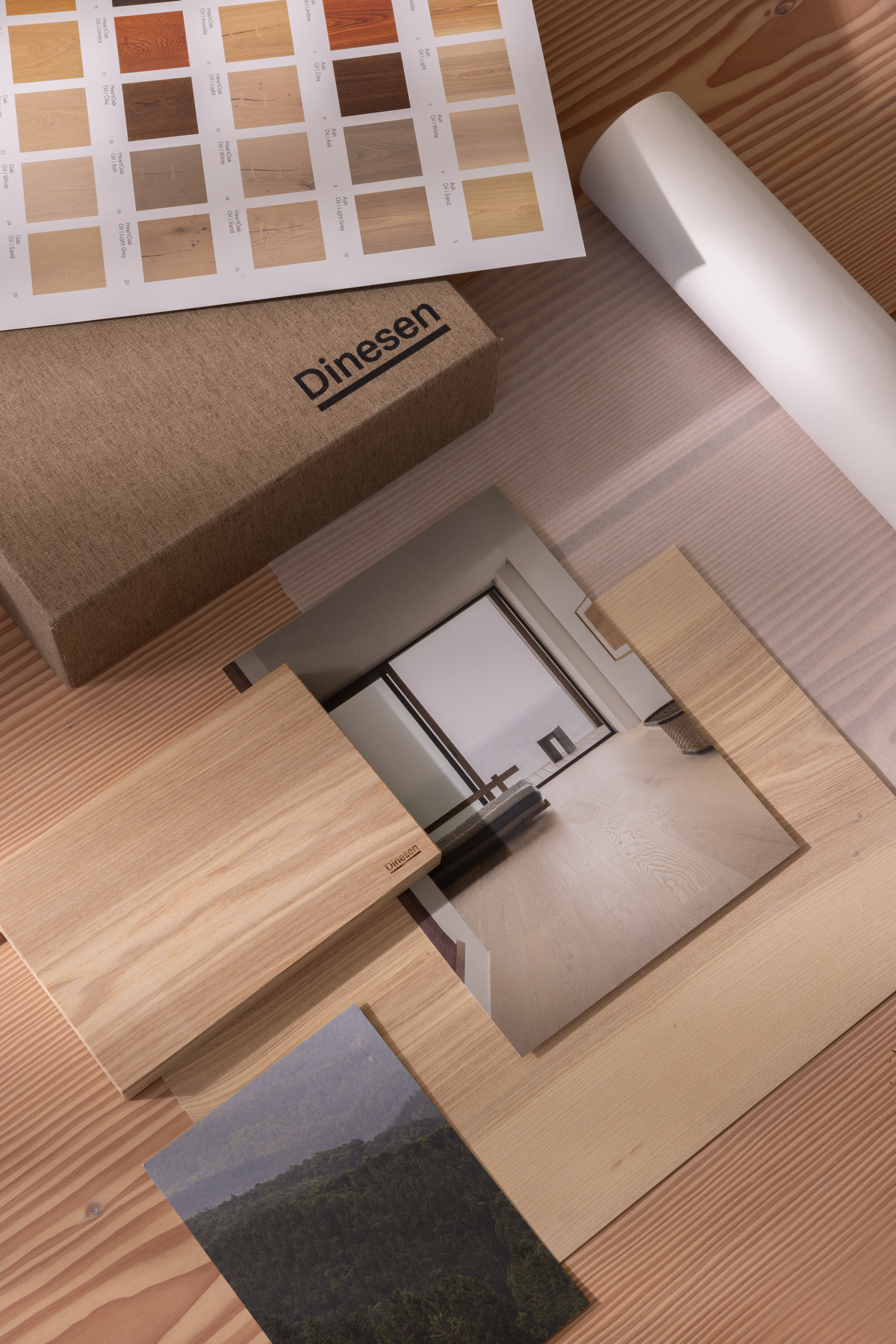 De stora provlådorna innehåller ytterligare föremål för att förbättra din upplevelse: högkvalitativa papperstryck som visar våra olika ytbehandlingar, en unik nyckelring av en Dinesen ek-slejf samt inspirationskort som visar utvalda Dinesen-projekt.